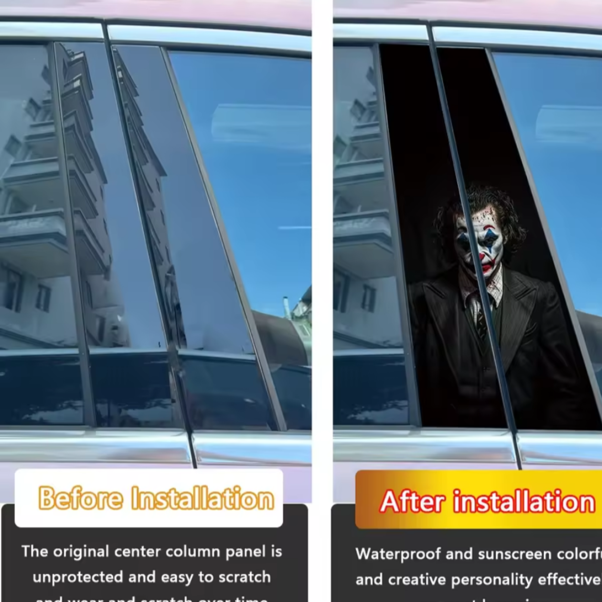 car pillar sticker, b pillar decal, joker car decal, car window decal, car door pillar wrap, personality car sticker, joker villain sticker, funny car sticker, scary cardecal, universal car accessory, exterior car sticker, waterproof car decal, sunproof car sticker, peel and stick car wrap, sedan pillar wrap, suv pillar wrap, automotive vinyl sticker, custom car decoration, unique car accessory, car prank sticker..Canva2000 , moto g screenshot, ai descriptions helper,