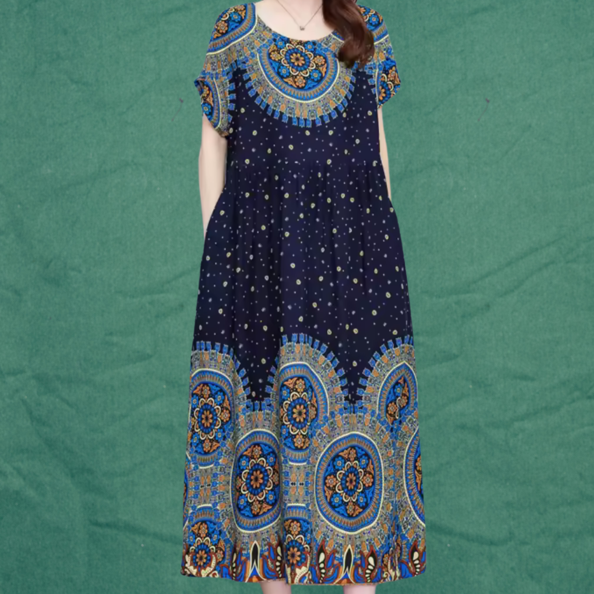 Features: Pockets, Short Sleeve, O-Neck, Mid calf dress length, pullover closure Type, natural fiber material, cotton blend fabric type, summer season, middle aged, none stretch,print on pattern Lose fit, A-line silhouette