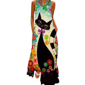 cat dress, black cat dress, artistic cat dress, colorful cat print, boho cat dress, whimsical cat art, ankle length dress, sleeveless summer dress, cute cat clothing, cat lover gift, abstract cat design, floral cat dress, unique art dress, casual loose dress, women boho fashion, statement cat outfit, vibrant print dress, artistic summer dress….2000px Canva…and BG… Removed