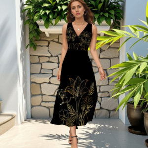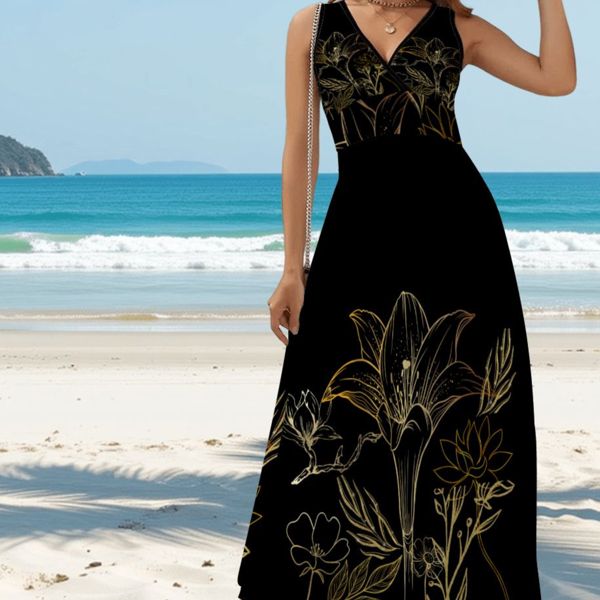 Step into effortless elegance with this Gold Lily Flower Long Sleeveless Dress, designed to blend comfort, style, and standout detail. Featuring a deep black base with luxurious gold floral artwork, this V-neck maxi dress adds a bold yet refined touch to your summer wardrobe.