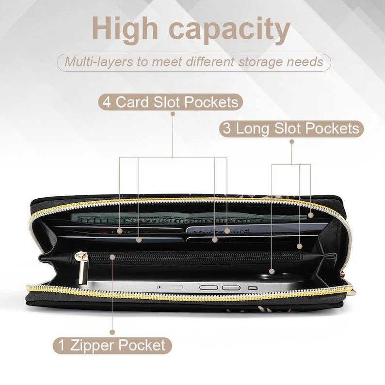 With 4 Card Slots Pockets,3 Long Slots Pockets,1 Zipper Pocket.