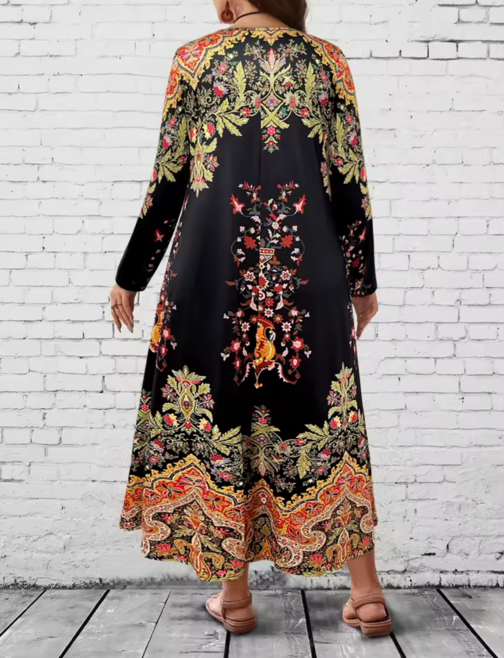 plus size dress, boho maxi dress, floral maxi dress, ethnic print dress, bohemian dress, fall maxi dress, long sleeve dress, v neck maxi dress, vintage boho dress, festival dress, casual maxi dress, loose fit dress, autumn dress, womens boho dress, plus size boho, pixel 6, no Canva 2000,