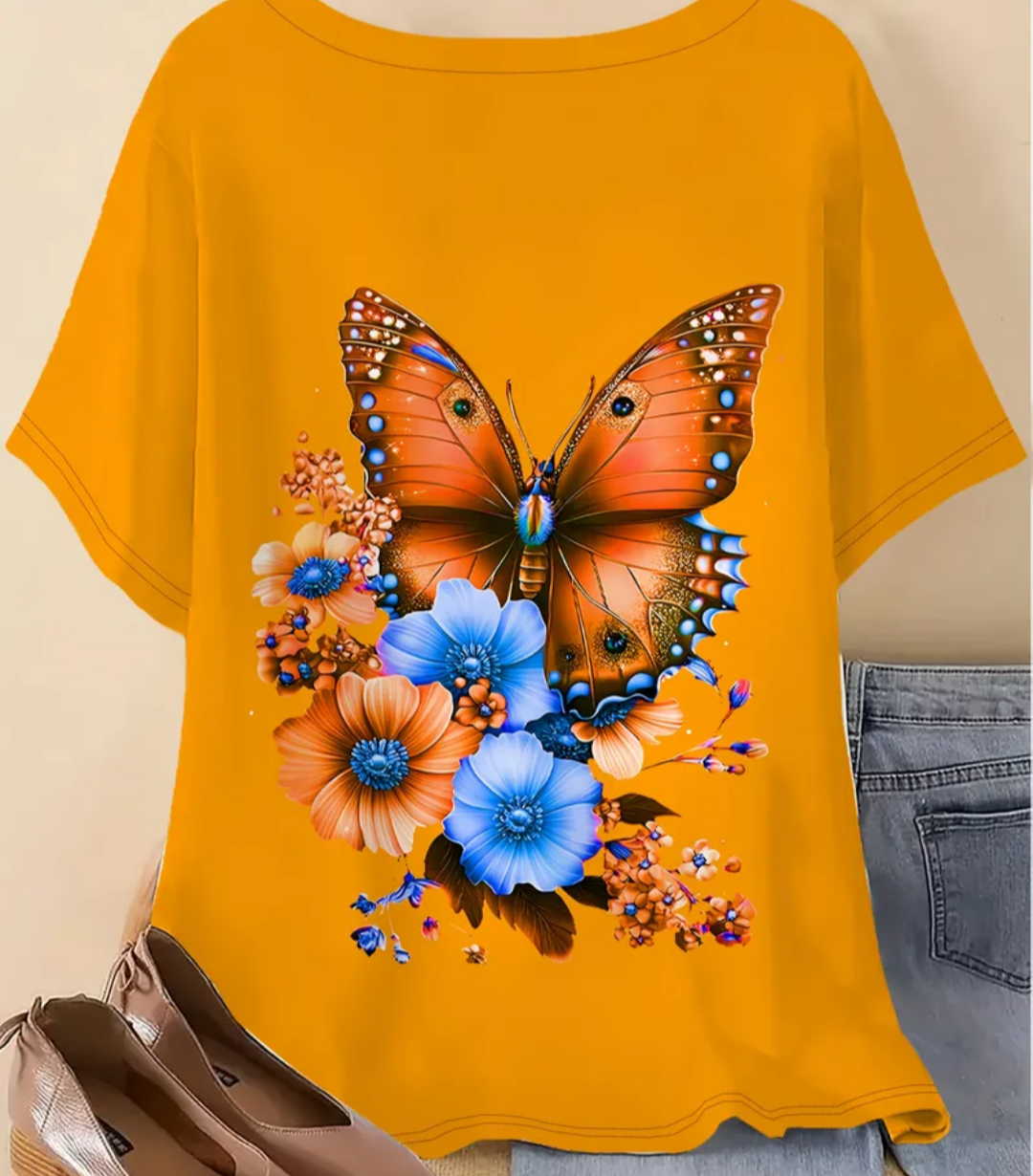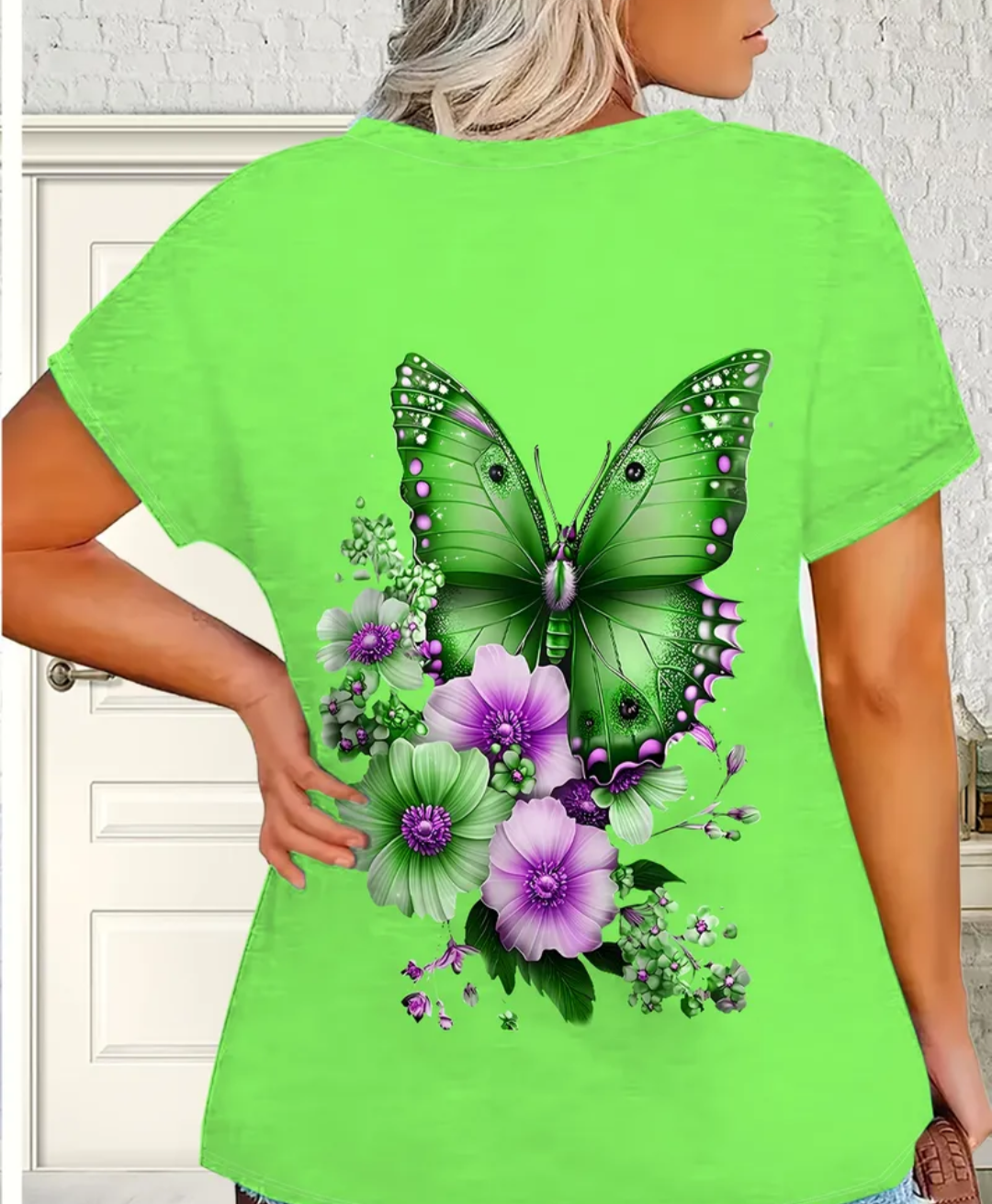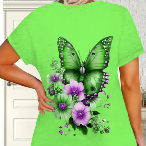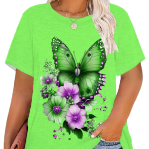 Add a pop of color to your wardrobe with this vibrant plus size butterfly and floral print T-shirt.