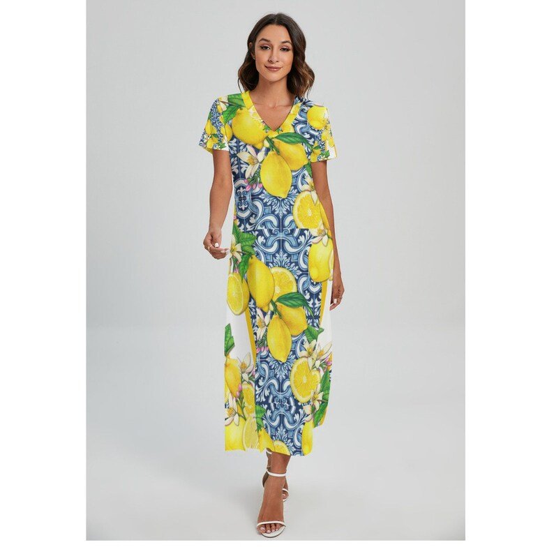 Sicily Inspired Side Slit Lemon V-Neck Dress (START🏀)