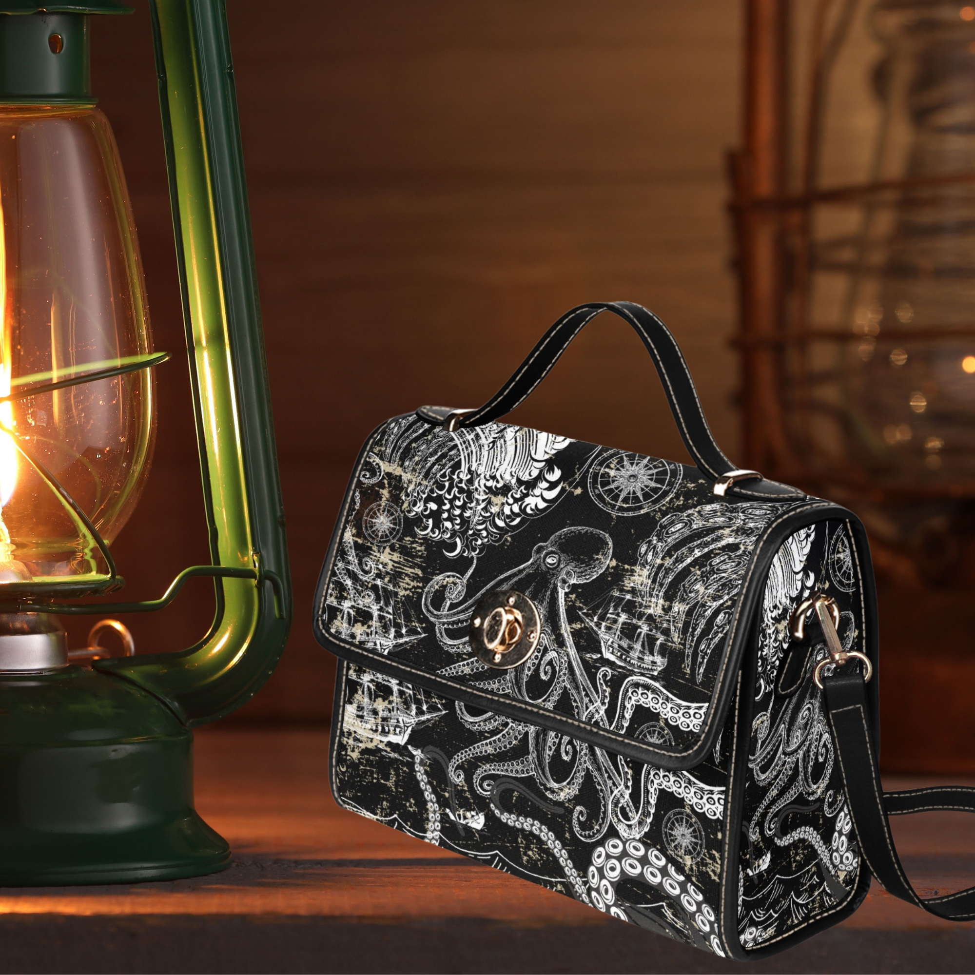 Inspired by antique sea charts, legendary kraken tales, and 19th-century maritime illustrations, this bag blends gothic elegance with nautical adventure.