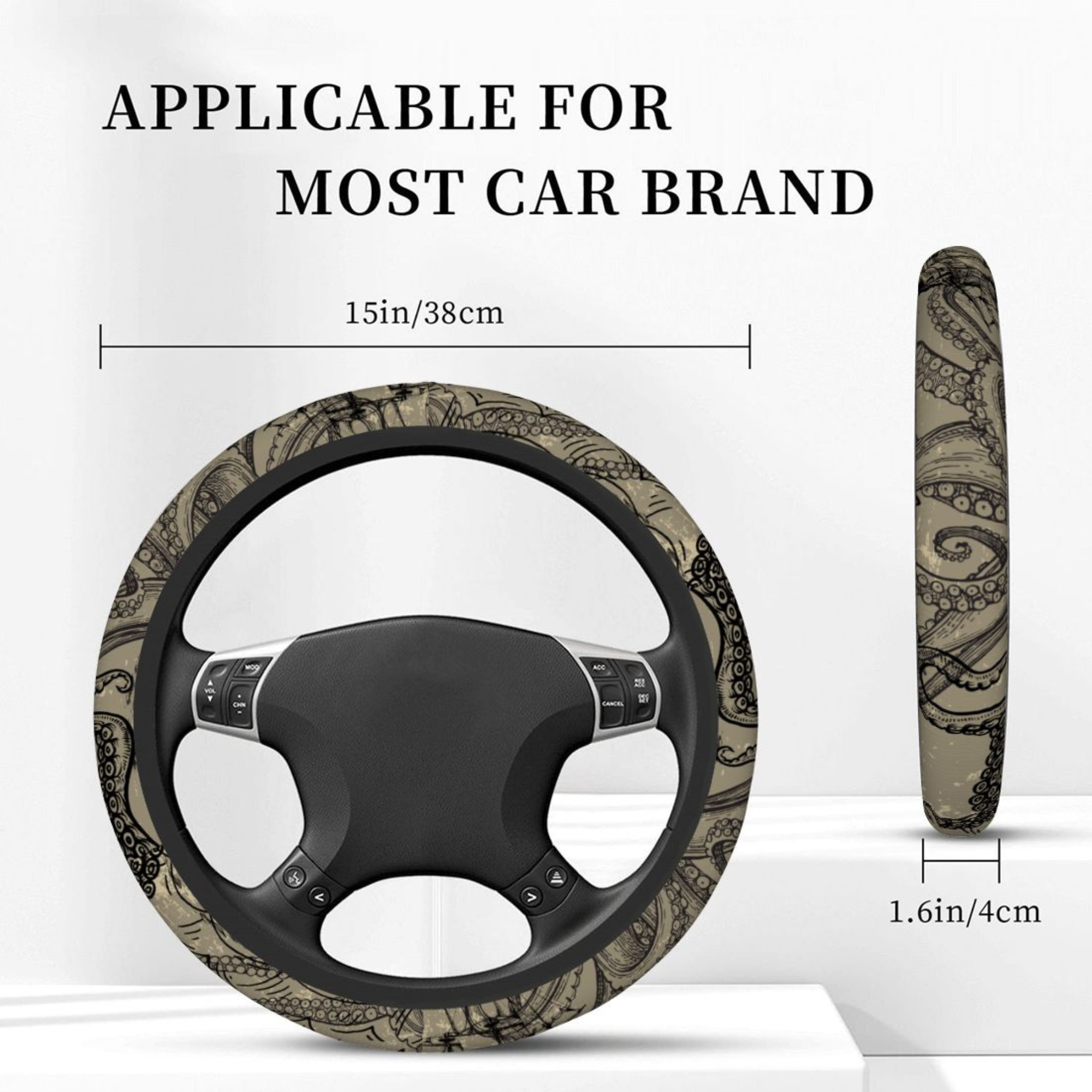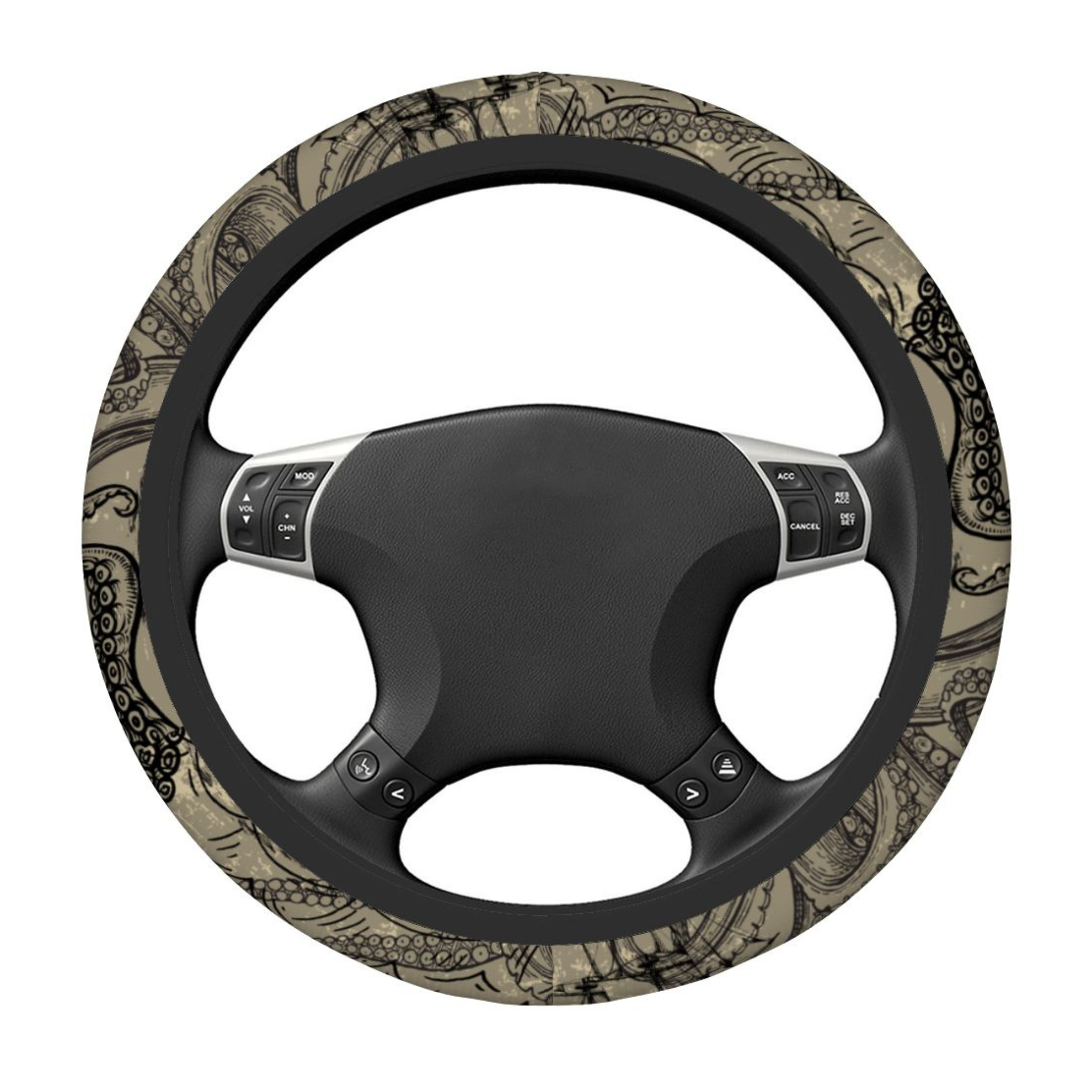 kraken steering cover, octopus wheel cover, tentacle car decor, vintage steering cover, nautical car accessory, sea monster decor, anti slip wheel cover, neoprene wheel cover, universal wheel cover, car interior upgrade, steering wheel protector, gothic car decor, ocean theme car, unique car accessory, truck wheel cover, suv wheel cover, artistic wheel cover, marine style decor. Resize and move, mockup 2000px